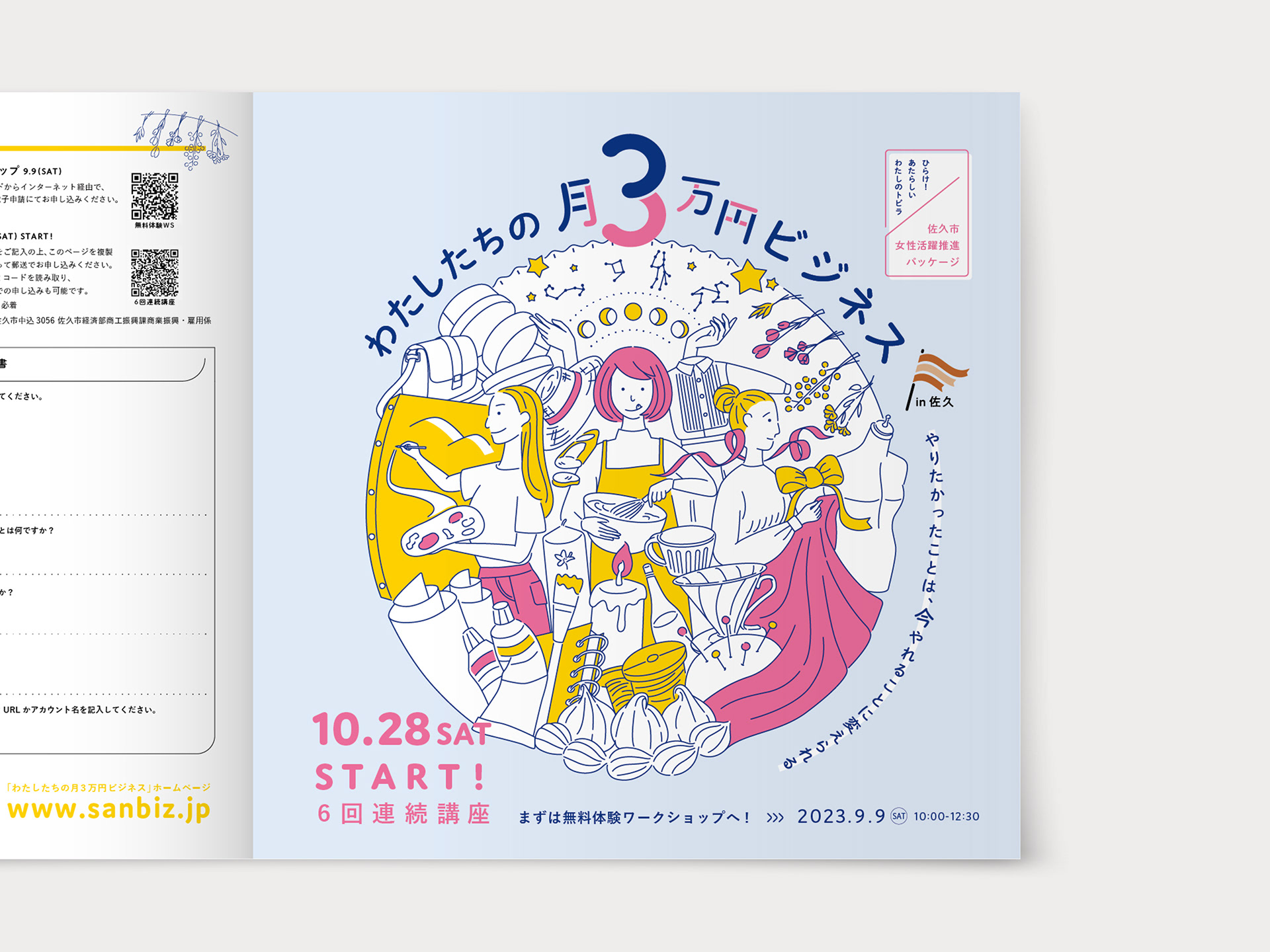 佐久市でスタートする、月3万円ビジネス講座のリーフレットとポスターを制作。社会にやわらかい革命を起こす、親しみやすい、生き生きとした、というイメージワードの元、曲線を多用しレイアウトを大胆にすることで、やさしさとおもしろさを表現しました。