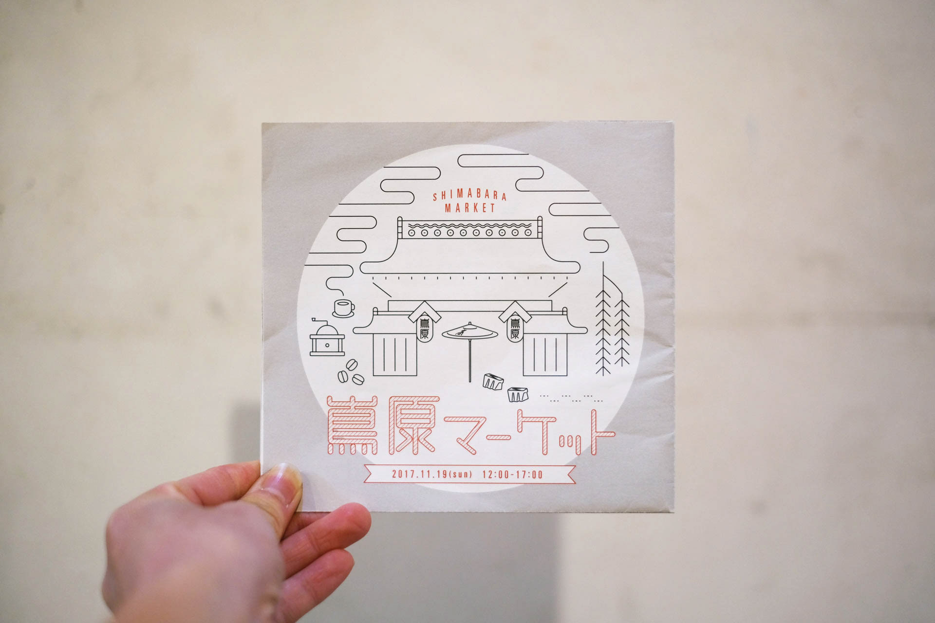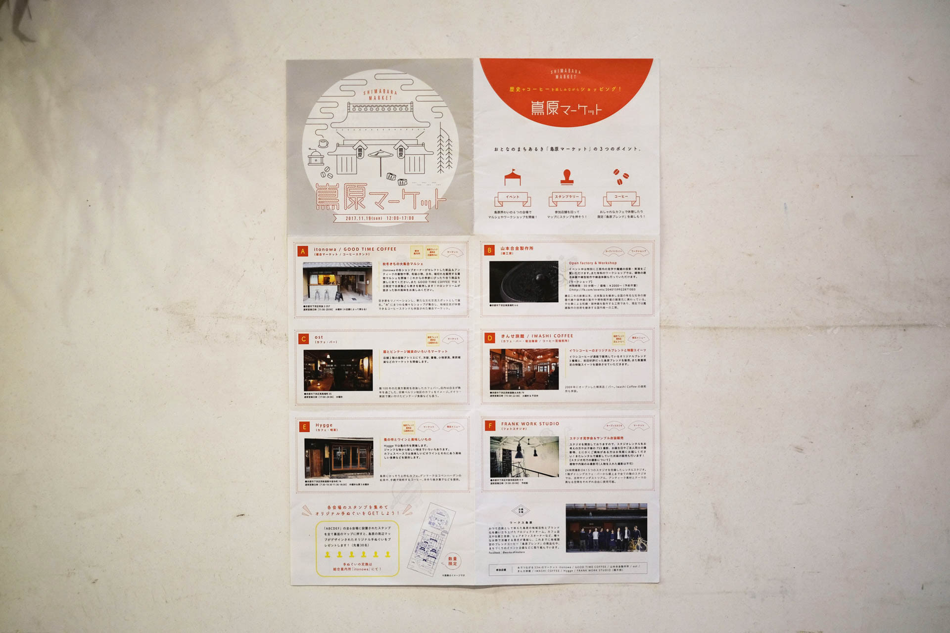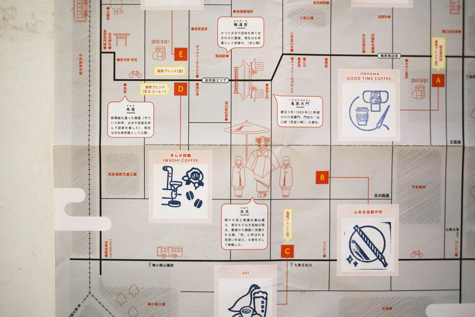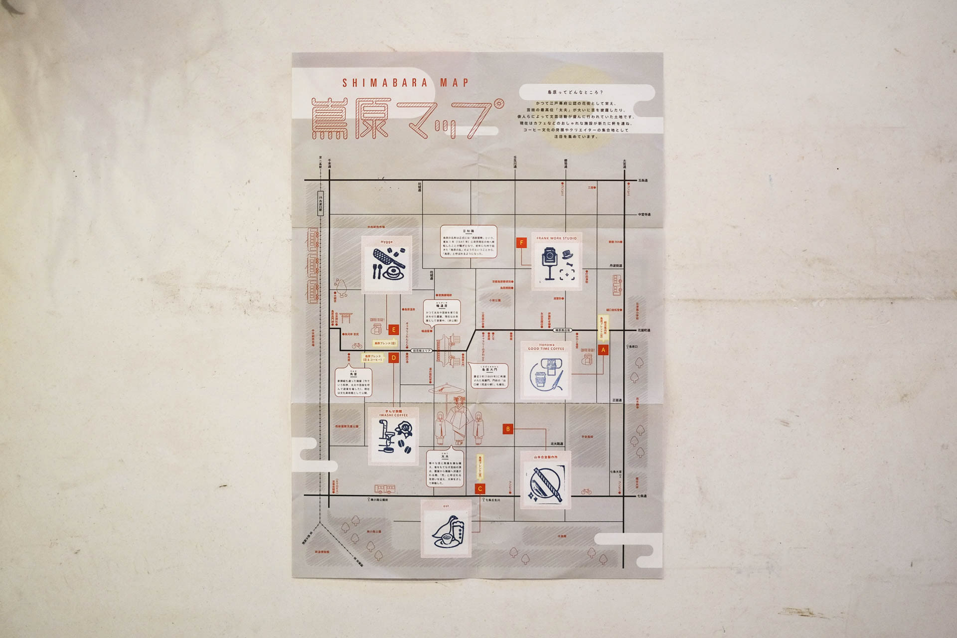 京都島原の周遊イベントを企画し、ディレクションと制作を担当。マップチラシは参加店舗を回るスタンプラリーの台紙として使用。ノベルティの手ぬぐいは地図を模したデザインになっている。