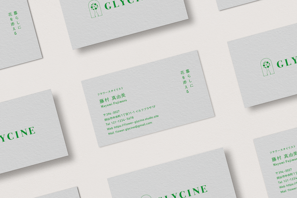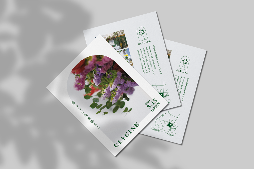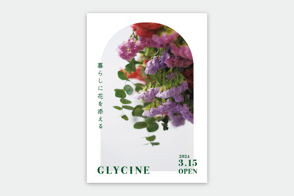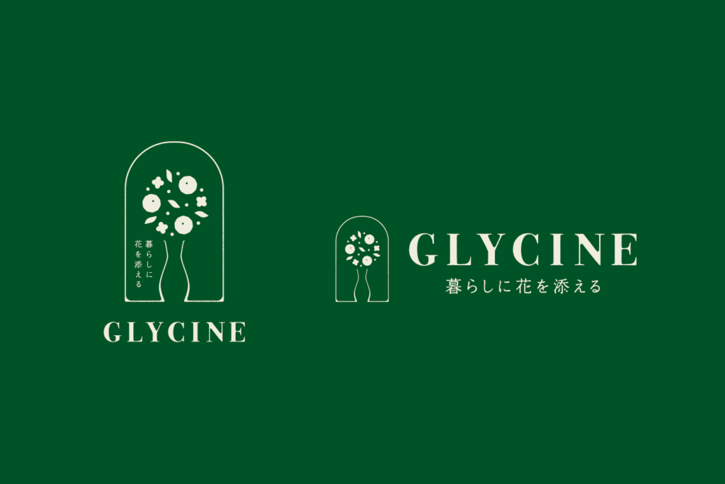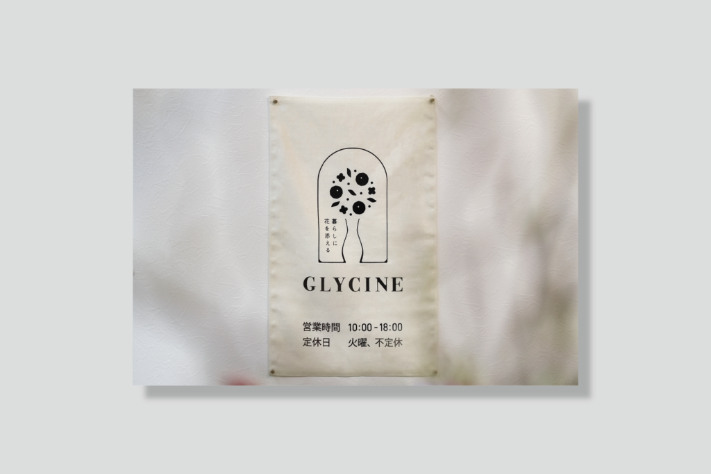 GLYCINEは、ご担当の藤村さまの「藤」をフランス語で表した店名。藤の花言葉のひとつである「歓迎」 と「暮らしに花を添える」というコンセプトから、生活の入口であるドアのモチーフと、花と花瓶のアレンジメントを組み合わせてロゴをデザイン。玄関から花を迎え入れるようなイメージで仕上げました。