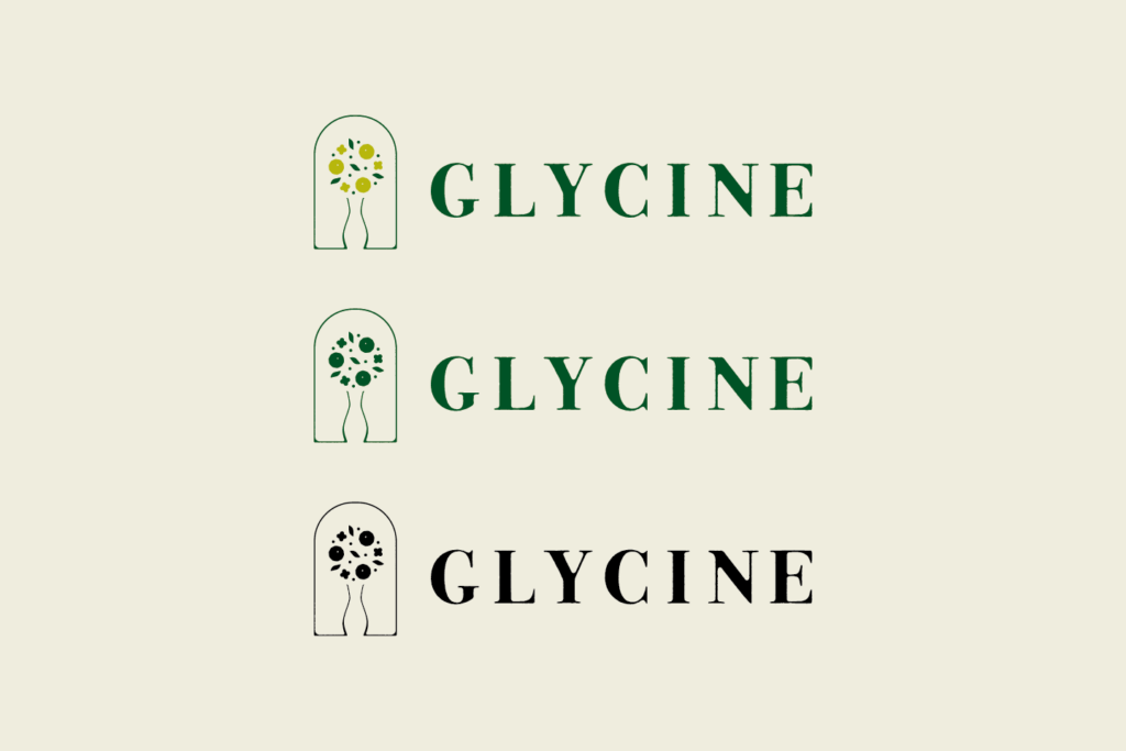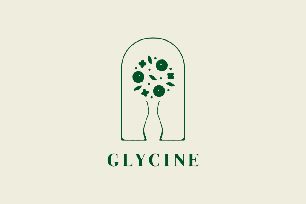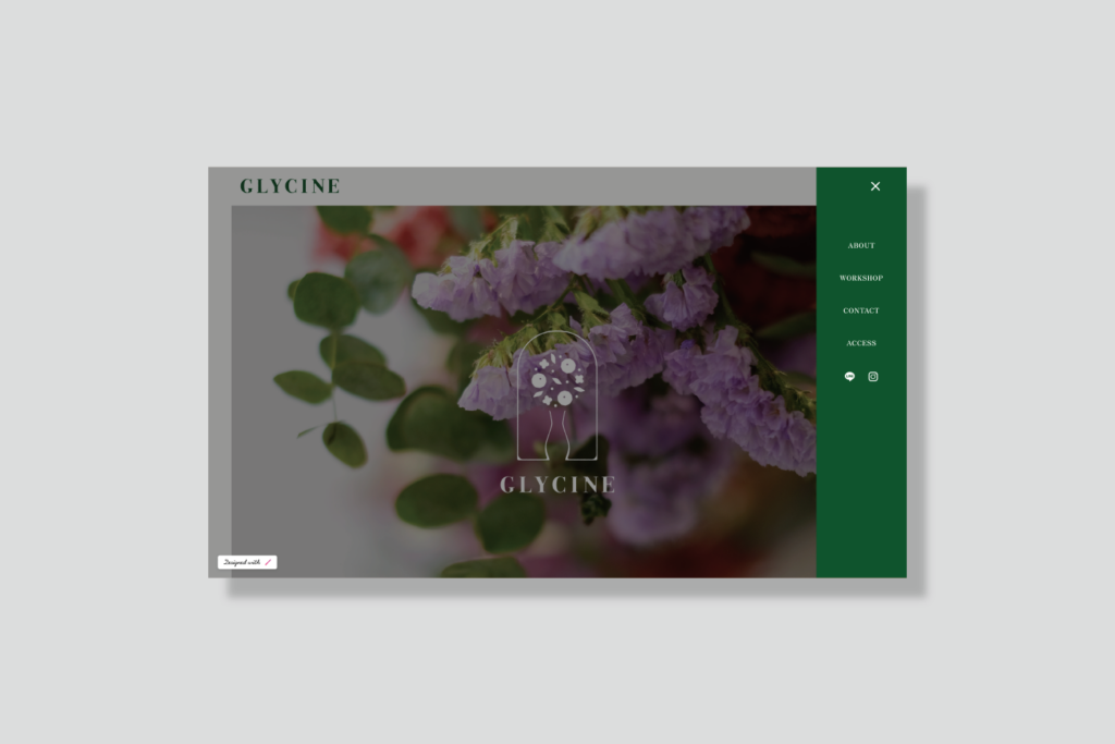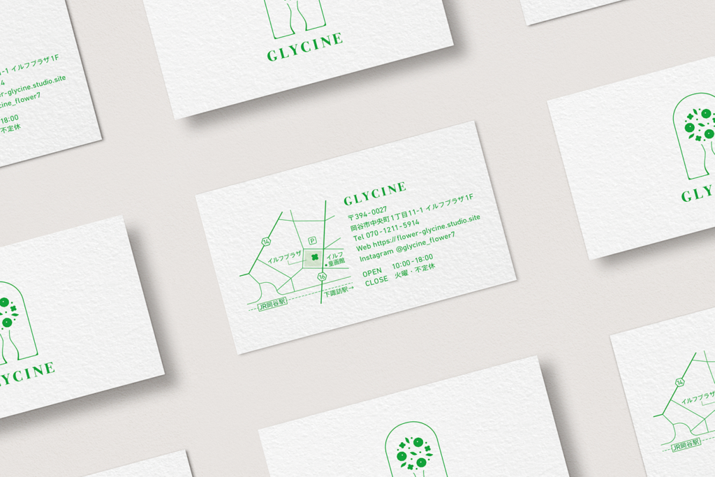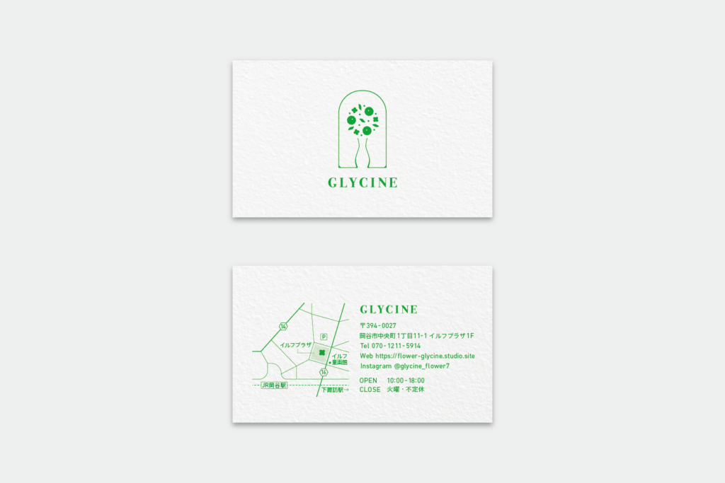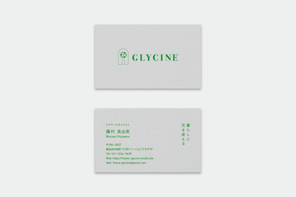 GLYCINEは、ご担当の藤村さまの「藤」をフランス語で表した店名。藤の花言葉のひとつである「歓迎」 と「暮らしに花を添える」というコンセプトから、生活の入口であるドアのモチーフと、花と花瓶のアレンジメントを組み合わせてロゴをデザイン。玄関から花を迎え入れるようなイメージで仕上げました。