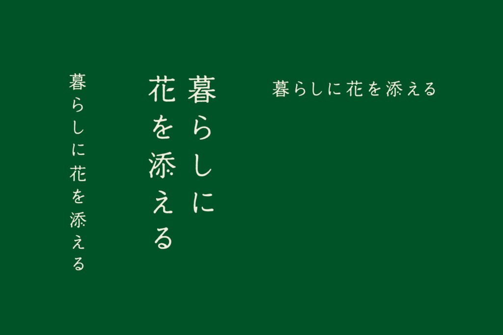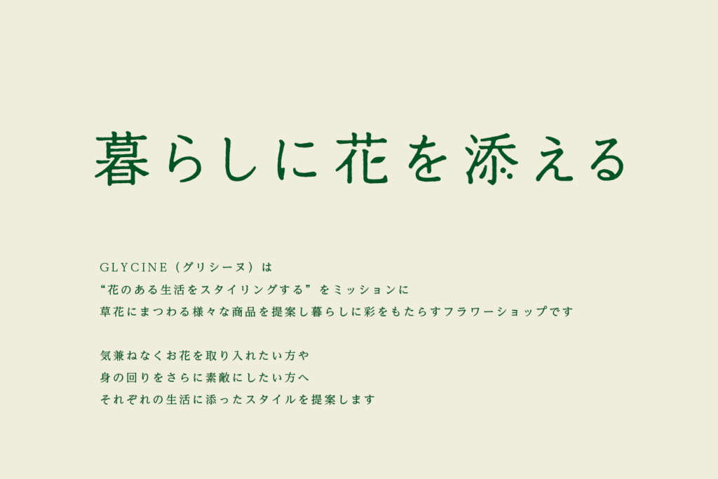 かんたんに長く花を楽しめるドライフラワーやアーティフィシャルフラワーを提案するGLYCINEのキャッチコピーを「暮らしに花を添える」とし、タイポグラフィ化しました。