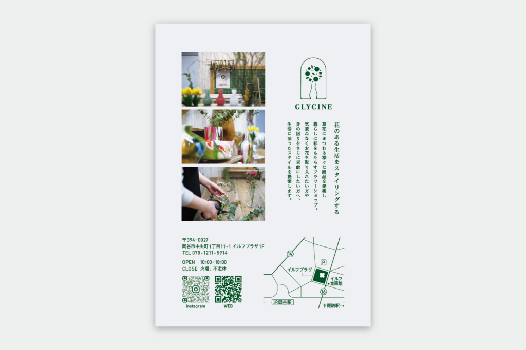 2024年4月にオープンした、花と生活雑貨のお店 GLYCINEさまのトータルデザインを担当しました。