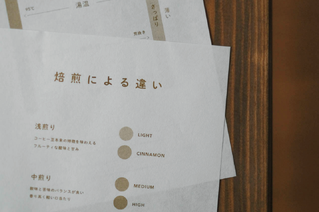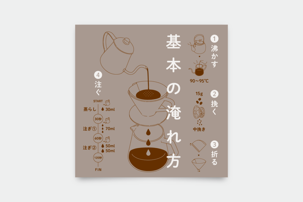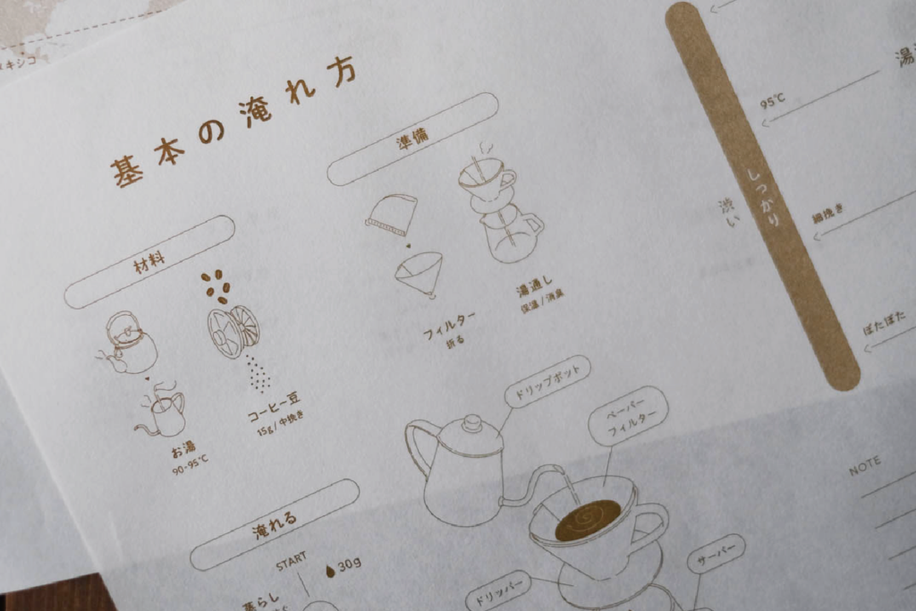 コーヒー豆のパッケージ、A6フライヤー、ハンドドリップのワークショップで使うガイドの制作、インスタグラムの運用なども自社で行っています。