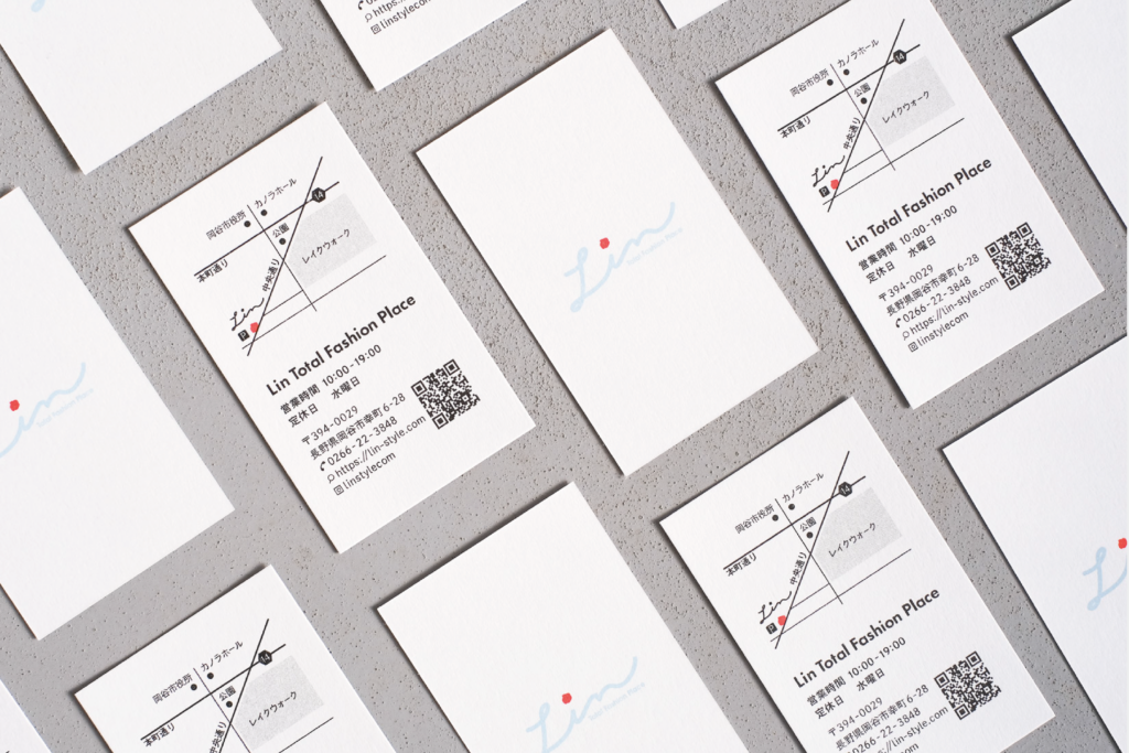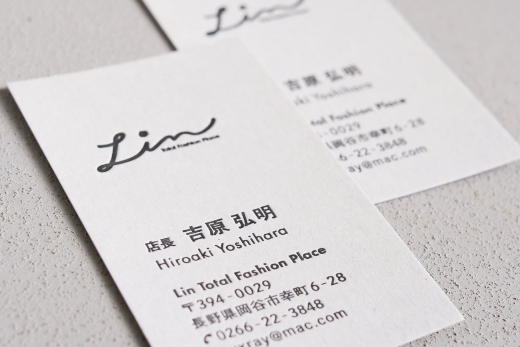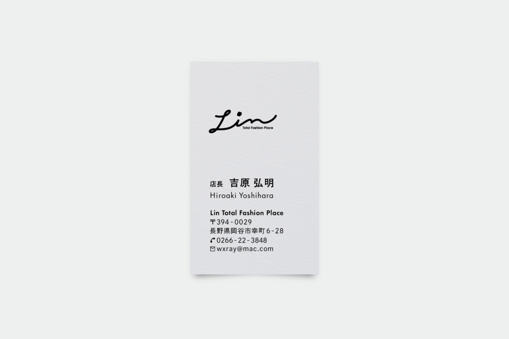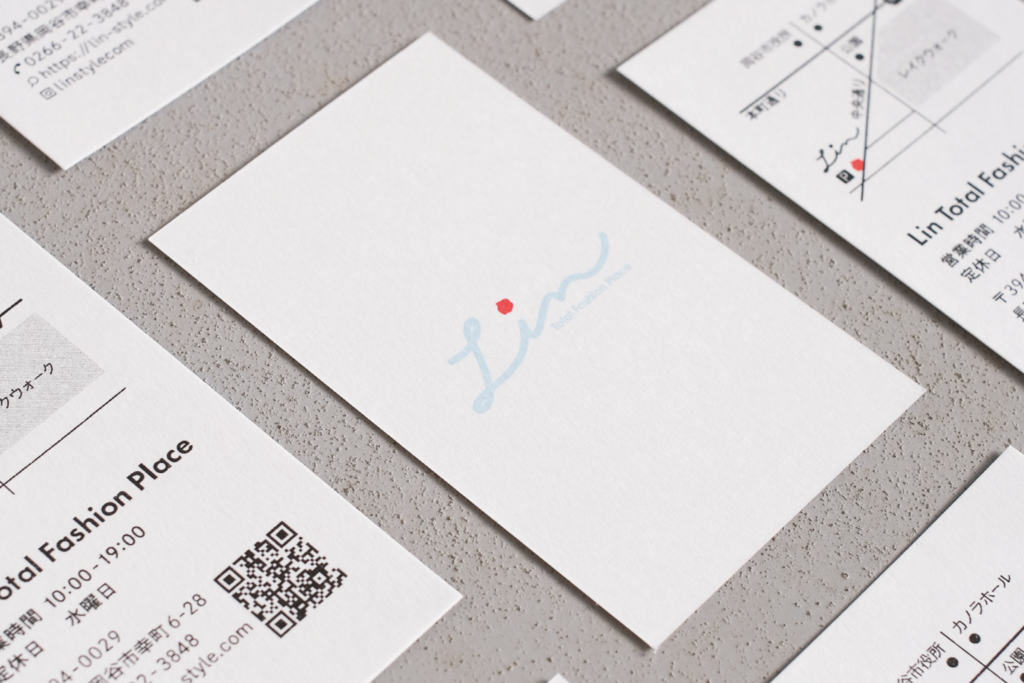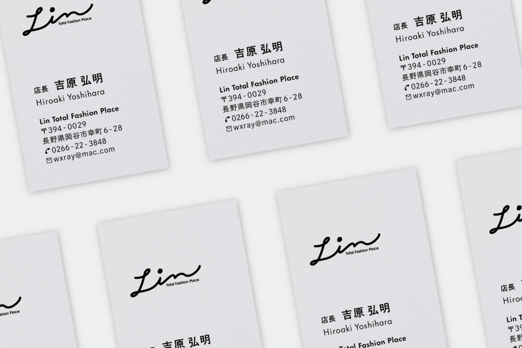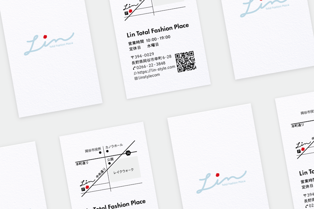 岡谷市にあるセレクトショップ、Linさまのショップカードを制作しました。カジュアルからフォーマルまで美しく着こなせる大人のアイテムがすっきりと並ぶ店内だったのでデザインもキレイめを意識しました。