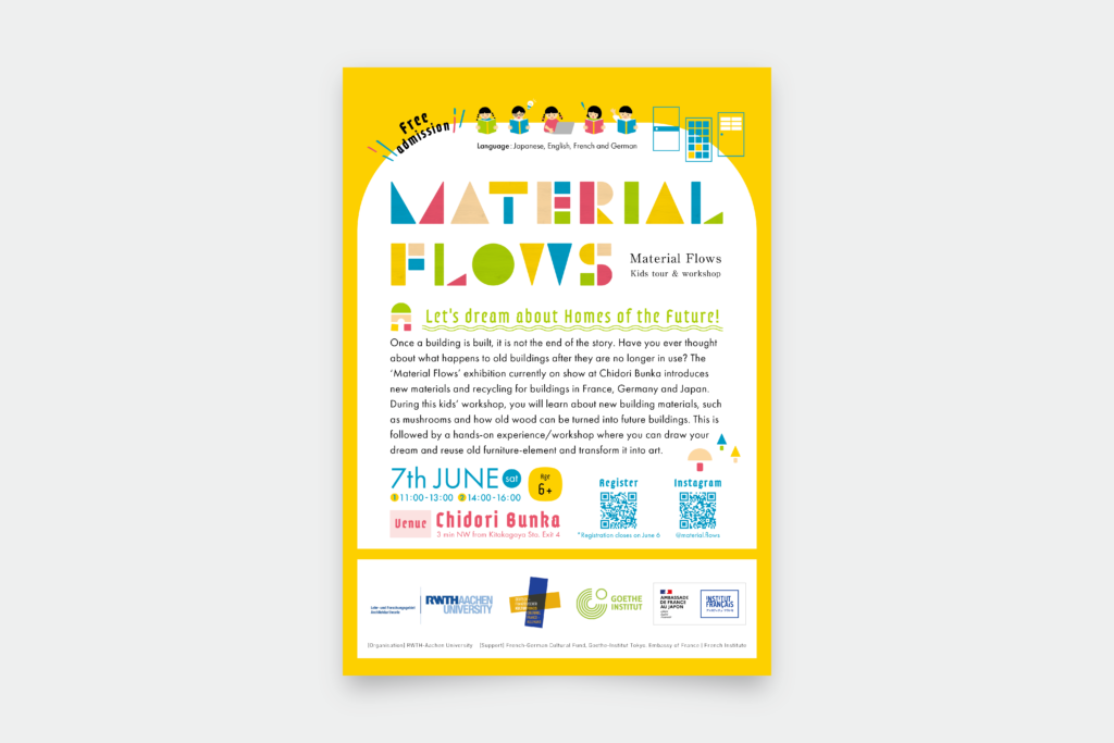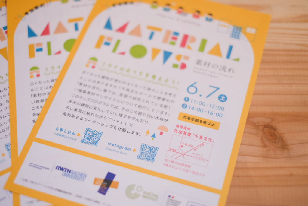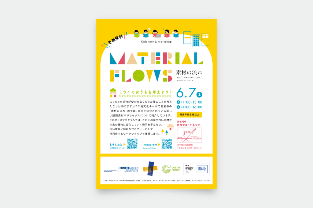 大阪、北加賀屋駅近くの千鳥文化で行われた子ども向けツアー&ワークショップのデザインを担当しました。このキッズプログラムは、建材のリユースとリサイクルについての新たな可能性を斬新な見せ方で展示する「素材の流れ」展の子ども向けワークショップ。アートを通じて建材の循環について学び、子どもたちに未来の家を想像してもらう企画です。ロゴタイプは、つみきをイメージしてデザインし、フライヤーには古い建具や、リサイクルの鍵になっているキノコの菌のグラフィックを散りばめました。