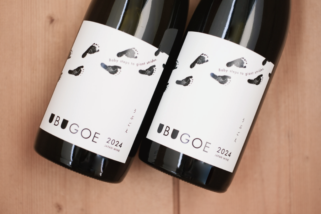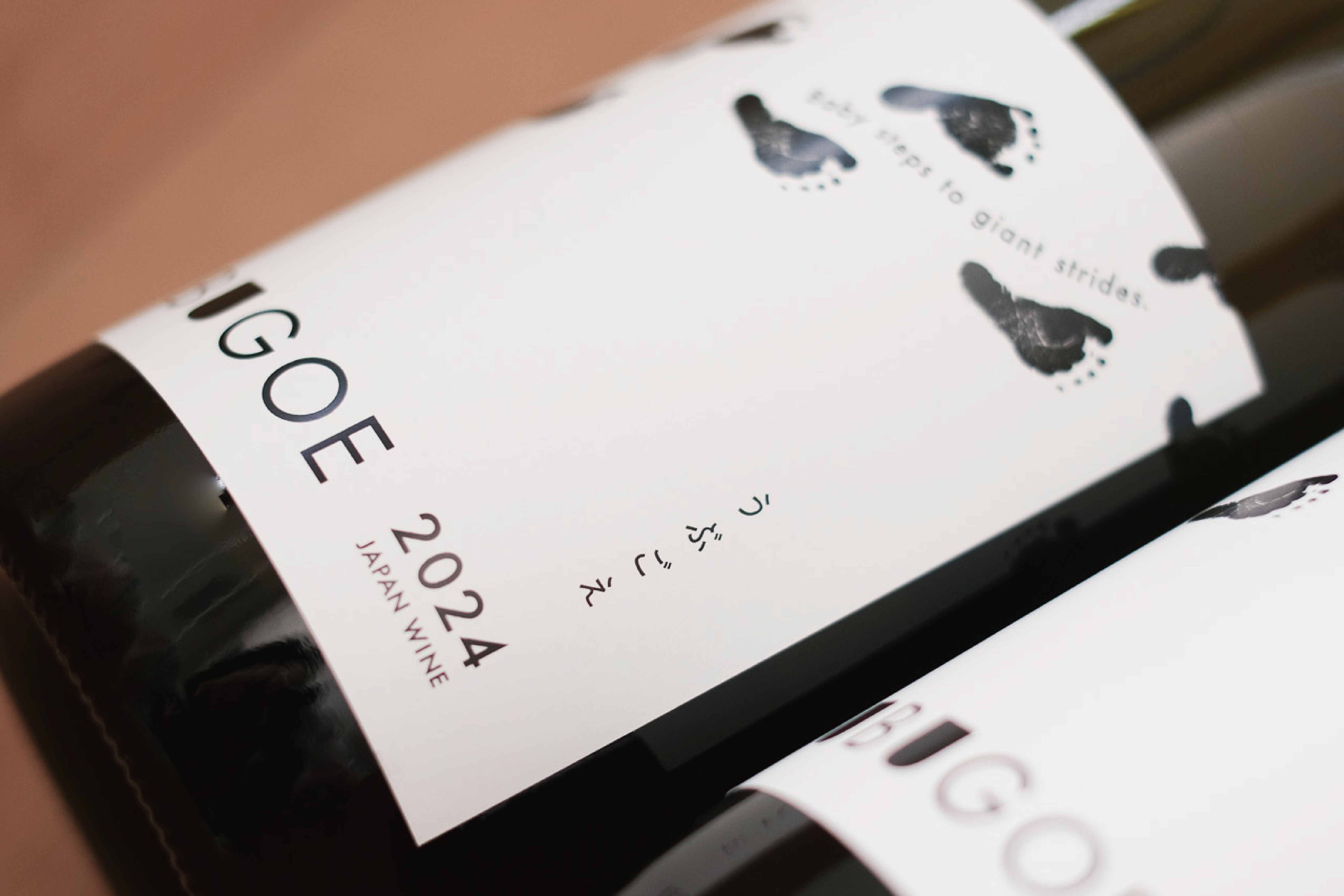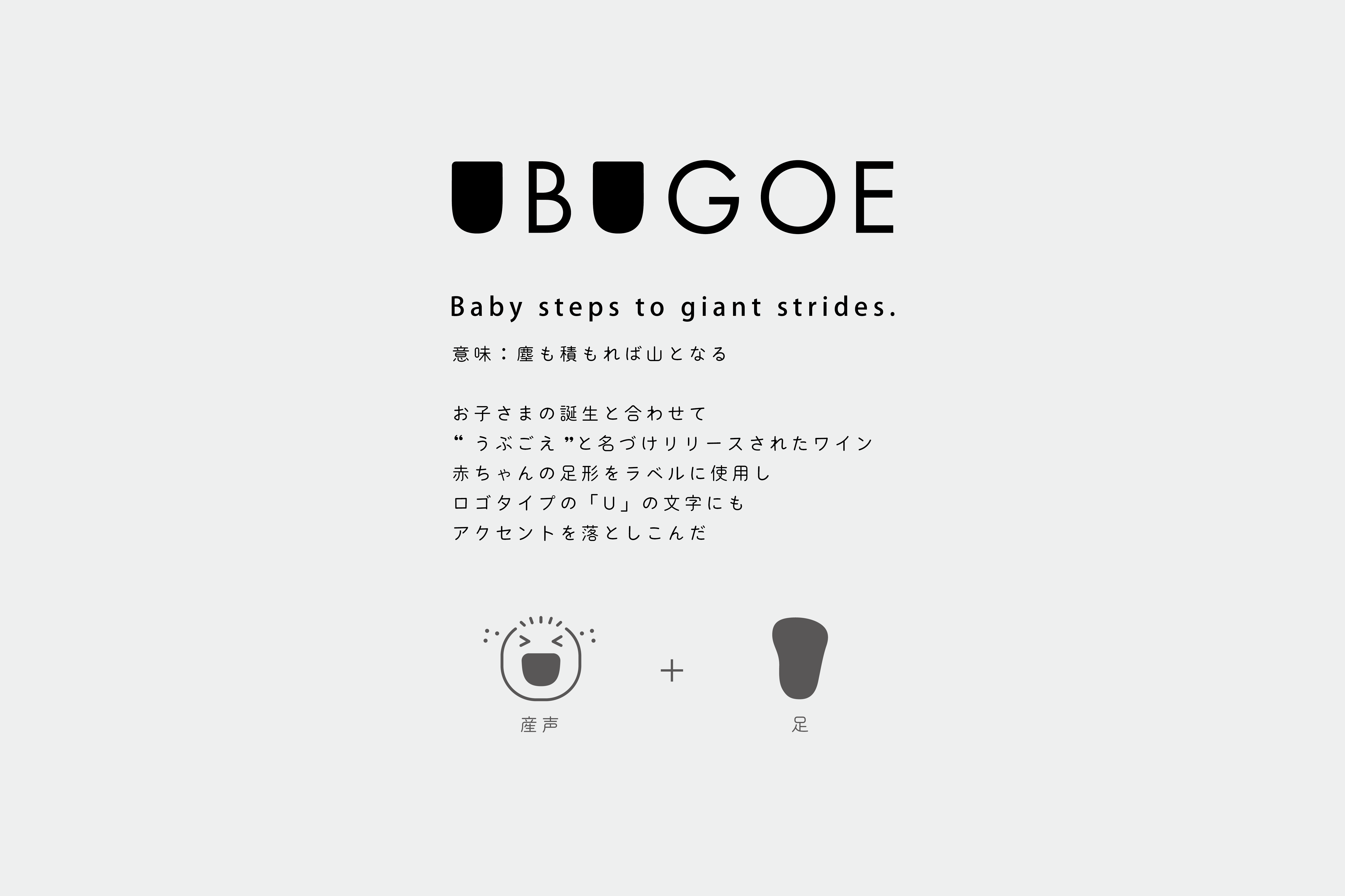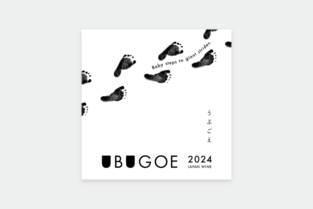 コンセプトの「Baby steps to giant strides.」は、日本語で塵も積もれば山となる、という意味です。オーナーのお子さんの誕生とワインのリリースの時期が重なり、UBUGOEと名づけられたワイン。コンセプトのstepというキーワードと重ね合わせ、お子さまの足形をデザイン上で使いたい、というご要望でした。