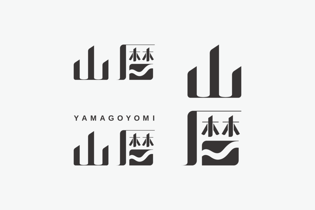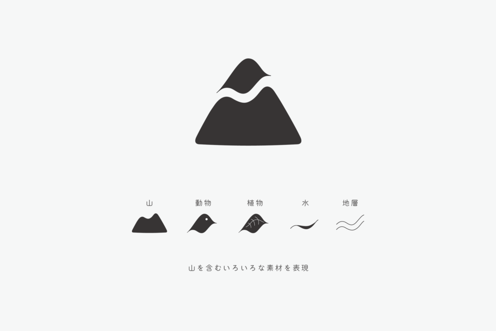 一目で山とわかるフォルムであることと、動植物や地質を感じさせる要素をとり入れてロゴをデザインしました。ロゴタイプはシンボルマークに形を寄せながら、どっしりと存在感のある太めの文字に仕上げました。