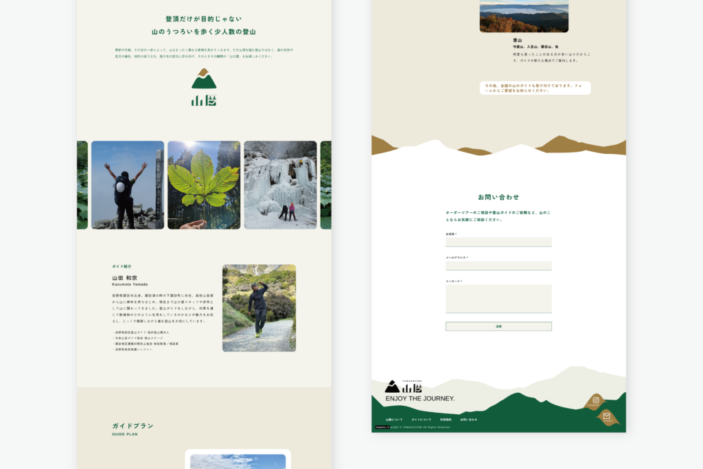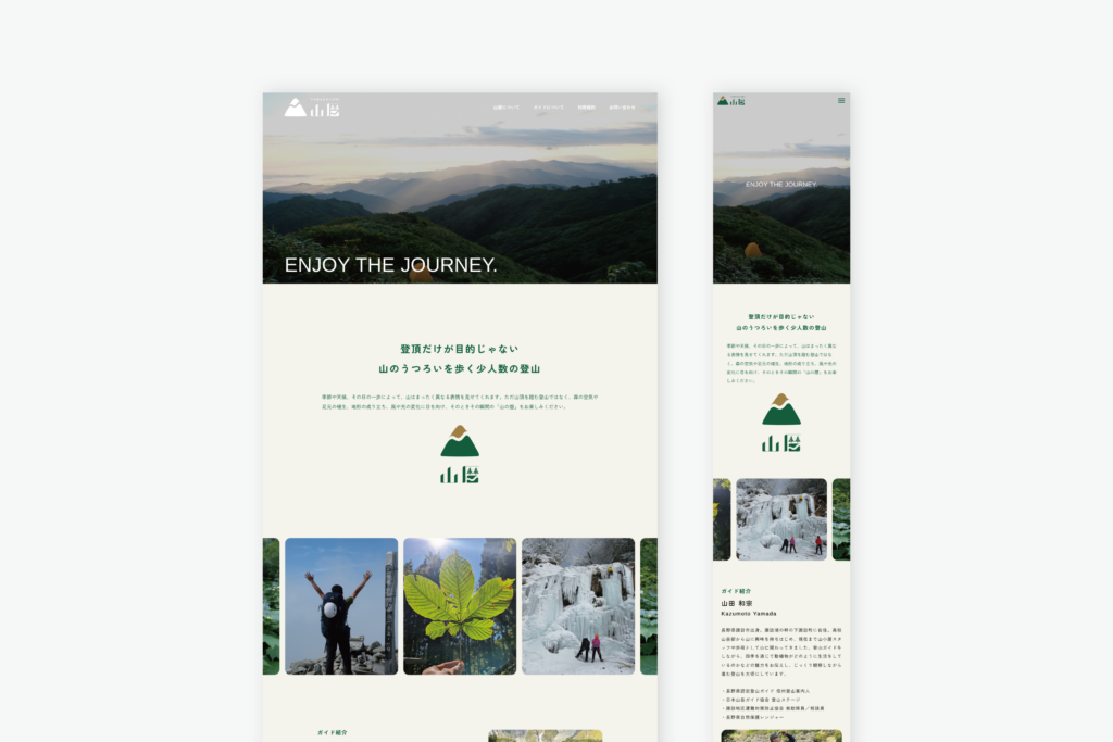 トップページと利用規約1ページで構成されたシンプルなウェブサイト。画像はご用意いただいた写真が綺麗だったので、うつくしい山の景色をたくさん使用しました。