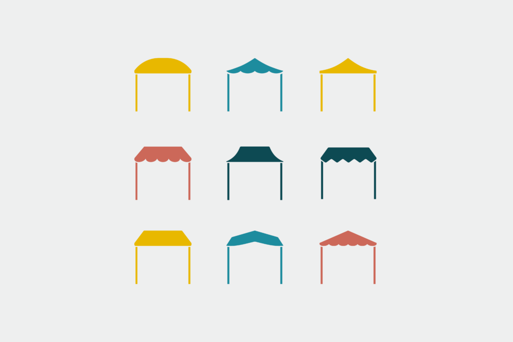 メインビジュアルには、くねっとした道にテントとポーズを決めた出店者さんをレイアウト。楽しそうな色合いと配置を心がけつつ、スマートさも感じられるようデザインしました。