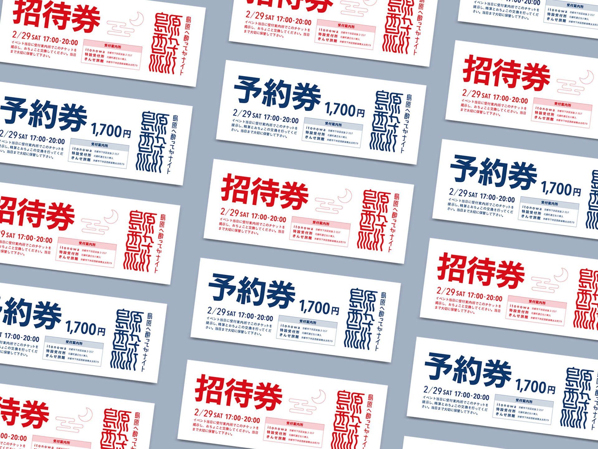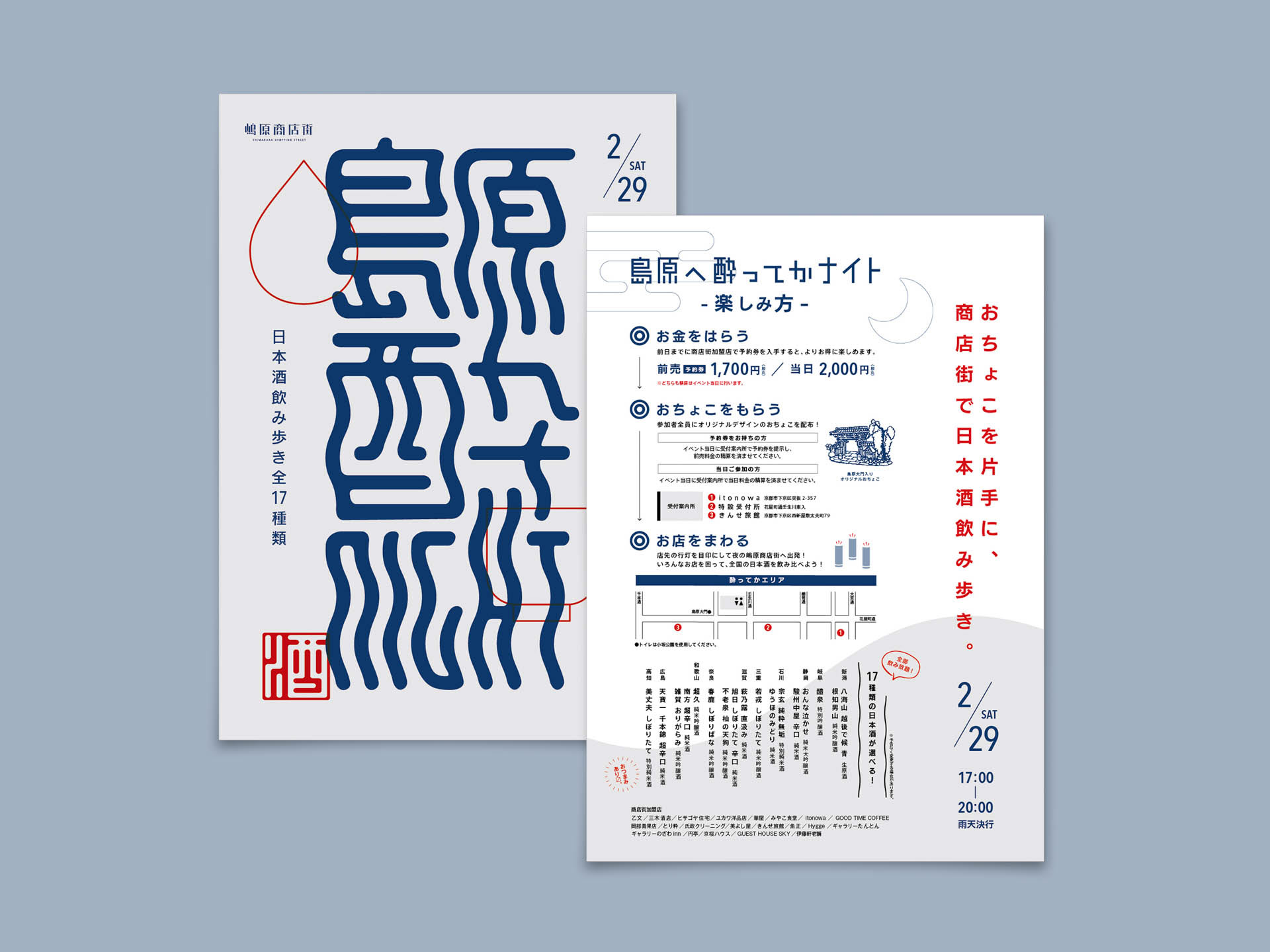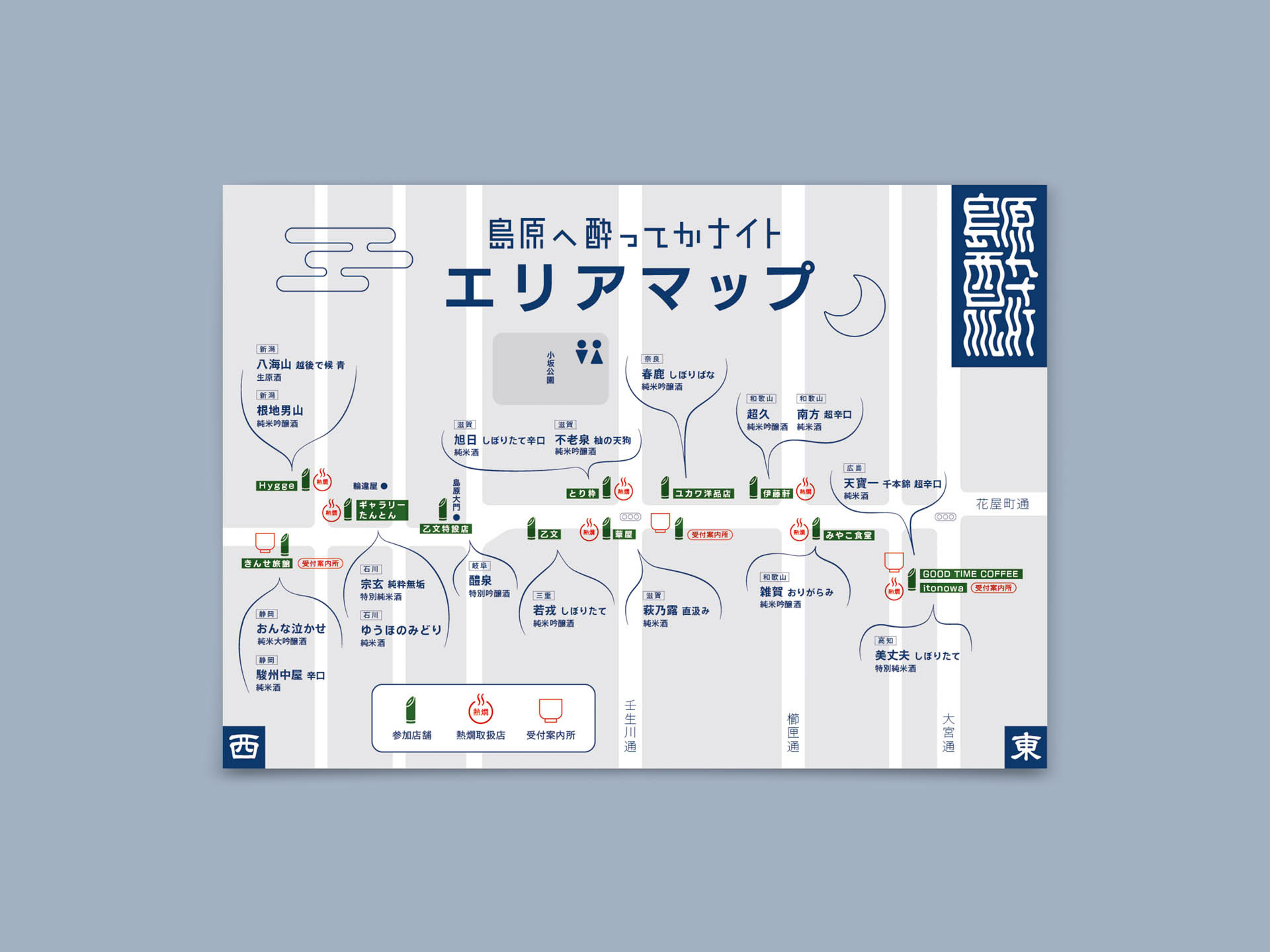 嶋原商店街で行われた日本酒の飲み歩きイベント。Takuma Nishiyamaデザインのメインビジュアルを元に、チラシや当日マップをデザイン。